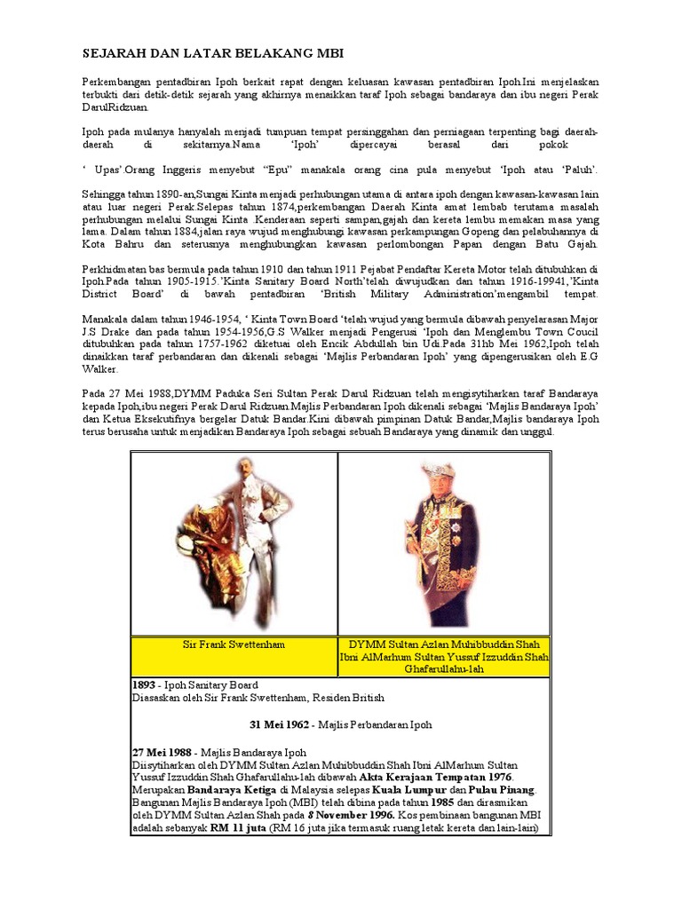 Datuk bandar yang pertama ialah dato hj. Hakcipta terpelihara 2016. Perkembangan industri dan pentadbiran ipoh amat berkait rapat dengan kebijaksanaan sistem organisasi para pemimpin dalam memastikan kelangsungan kemajuan negeri ipoh.