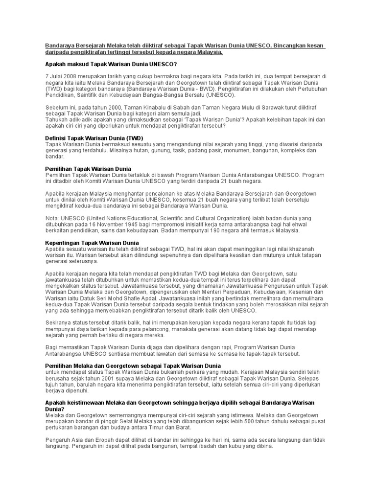 Keistimewaan bandaraya melaka sebagai tapak warisan dunia unesco. Bandaraya ini diisytiharkan sebagai unesco tapak warisan dunia selain daripada georgetown pulau pinang pada 7 julai 2008. Bandaraya melaka بندراي ملاك bandaraya bersejarah merupakan ibu negeri melaka malaysia bandaraya ini merupakan bandar ke 8 diwujudkan di selatan malaysia. Bandaraya ini merupakan bandar ke 8 diwujudkan di malaysia.